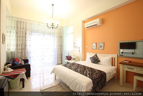 房間裡面很寬敞,有一面強漆上橘色很跳脫,個人滿喜歡的,還有小沙發跟陽台